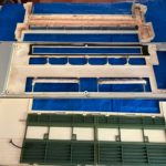 電装部を丁寧に養生し、熱交換器、ファン、ドレンパンなどを一つひとつ取り外して、専用の洗剤と高圧洗浄機で徹底的に洗浄します。