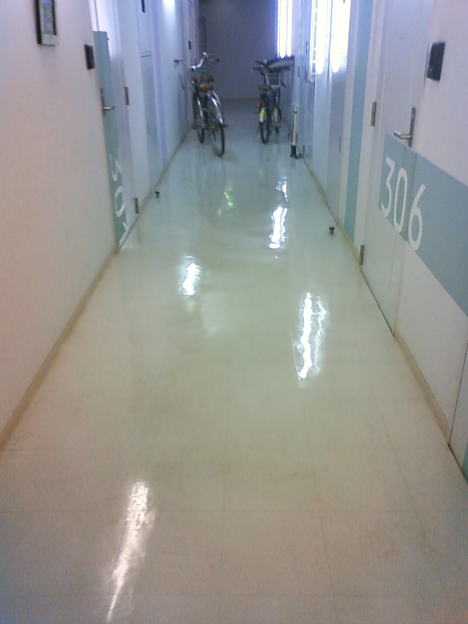 大田区田園調布で作業! エレベータ内の写真のような汚れ(のり、テープ)落とし。 廊下の壁面や床をピカピカに… 今から北区赤羽北の現場に向かわなければ!