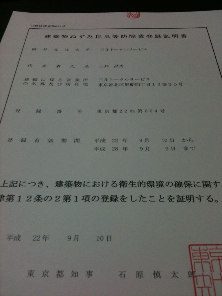 本日、東京都より建築物ねずみ昆虫防除業登録証明書が届き、公的な事業登録が完了しました。