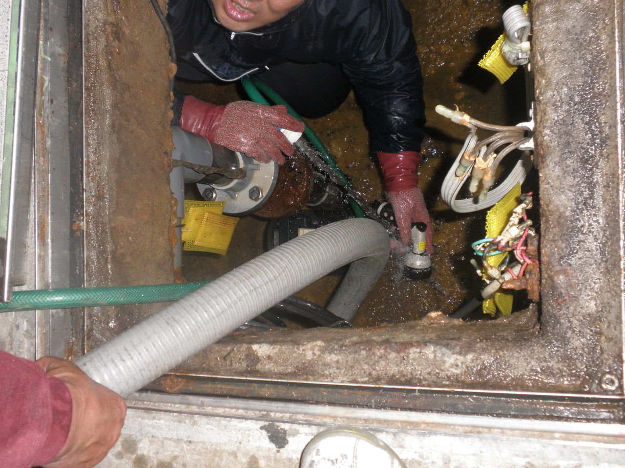 汚水槽の中に入り、しっかりクリーニング!