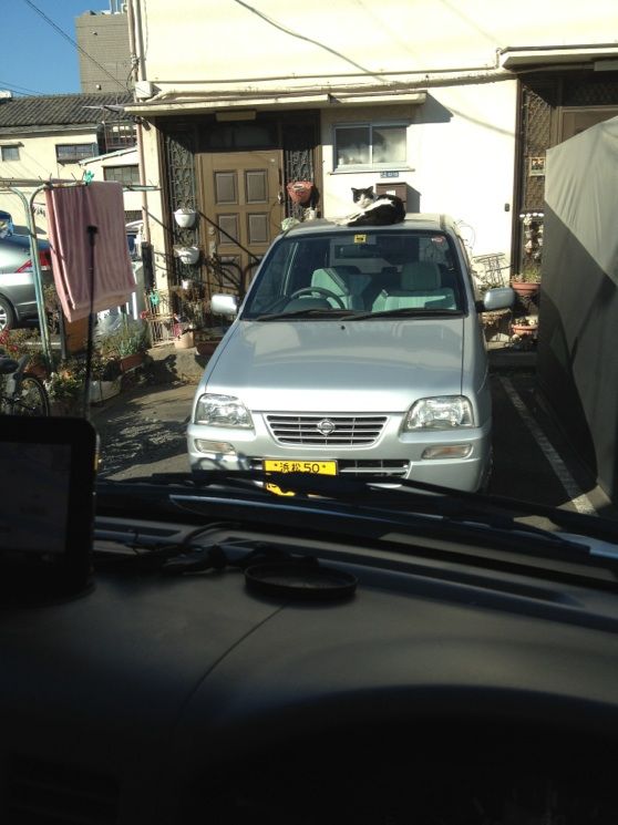 ネコはコタツでまるくなるはずが、弊社車の上で日向ぼっこ…