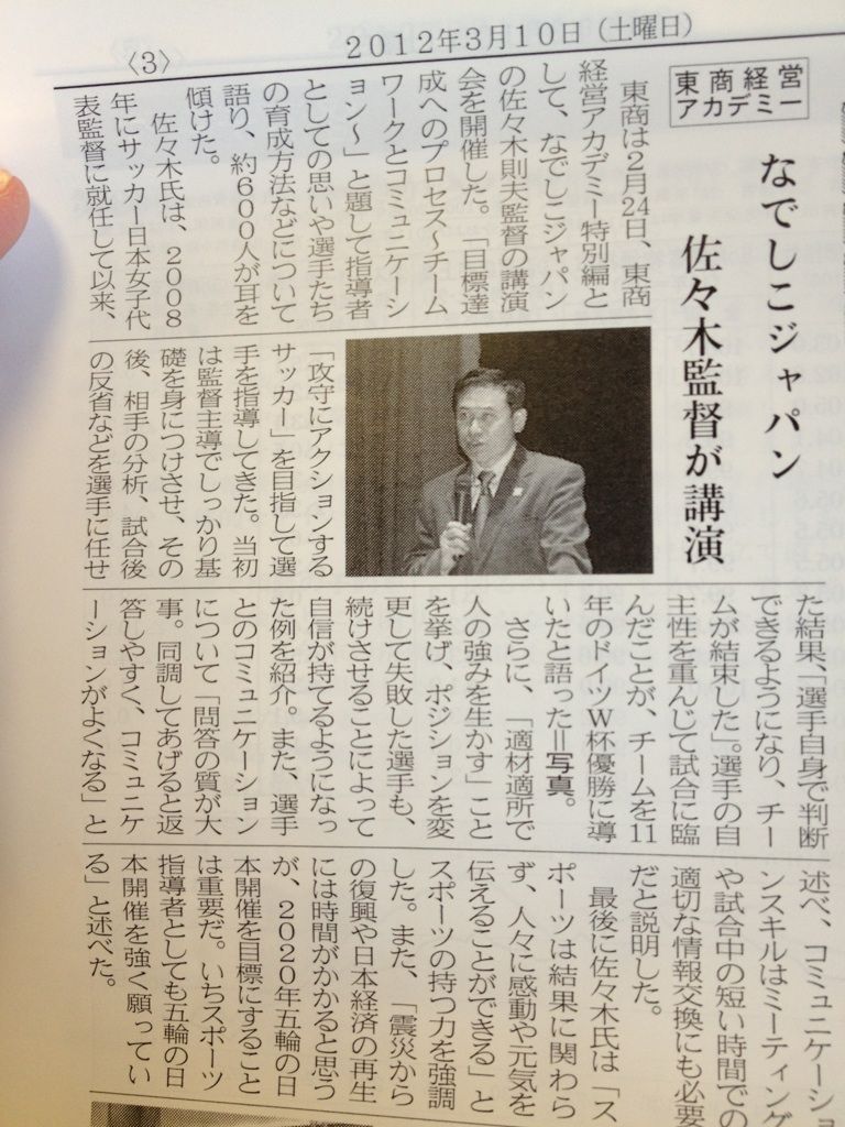 東商新聞になでしこジャパンの佐々木監督の講演記事が掲載されていました。